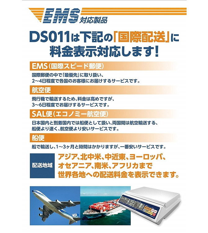 【スタッフのコメント】 2017年6月の新郵便料金に対応したデジタルスケール。信頼のアスカブランドの中でも、人気の鉄板モデルです。O(ゼロ)スイッチは、重さを0にする機能で例えば、お皿の重さを除いた食品の重さ、などを量ることもできます。最大10kgまでの配送物の国内・国際郵便料金が瞬時にわかります。また選択スイッチを切替えるだけでコスト比較もできるから予算に合わせた最適な配送方法を見つけることができます <使い方> 1、国内郵便 ○種類スイッチを押し種類を選択します。〔定型〕〔定型外〕〔ゆうメール〕の順番に切り替わります 2、国際郵便 ○国内/国際スイッチを押し〔国際〕を選択します ○種類スイッチを押し種類を選択します。〔定型〕〔定型外〕〔印刷物〕〔小型包装物〕〔国際小包〕の順番に切り替わります ○送付便スイッチを押し送付便を選択します。〔航空便〕〔船便〕〔SAL〕〔EMS〕の順番に切り替わります ○地帯スイッチを押し地帯を選択します。〔第1地帯〕〔第2地帯〕〔第3地帯〕〔第4地帯〕の順番に切り替わります(配送したい国がどの地帯に該当するか不明な場合は、取扱説明書内の国別地帯一覧表でお確かめください) 3、特殊取扱料金の設定 ○〔速達〕〔書留〕〔簡易書留〕を設定する場合はそれらのスイッチを押して設定します。押すたびに「ON/OFF」が切り替わります <主な機能>オートパワーOFF機能:安定表示が約90秒間続くと自動的に電源がOFFになります 風袋引き機能:ゼロスイッチを使って重さ0にできます(容器の重さを含めず測定したい場合に使います) HOLD機能:この機能を使うと測定物をおろしても質量・料金は表示されたままになります(再度HOLDスイッチを押すことで解除されます) <仕様> 最大計量:10kg 最小表示:3g 目盛:1kg未満→1g、1kg以上2kg未満→2g、2kg以上5kg未満→5g、5kg以上10kg未満→10g 安定所要時間:約2秒間 使用電源:付属のAC専用アダプターまたは乾電池単3形×4本(別売) 消費電流:42mA(液晶バックライトON時) 外形寸法:W261×D276×H74mm(計量皿250×170mm) 質量:1.2kg 使用温度:10~40℃ 付属品:専用ACアダプター、取扱説明書、保証書(1年)、使い方カード